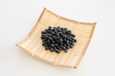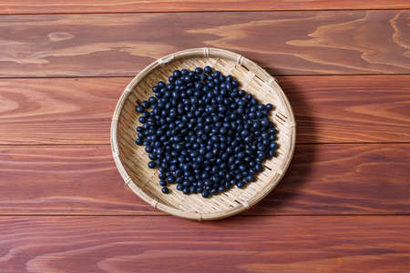 Black soybeans on the bamboo colander isolated on a wooden background.