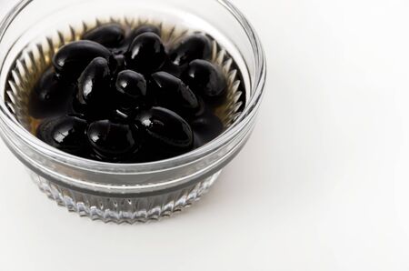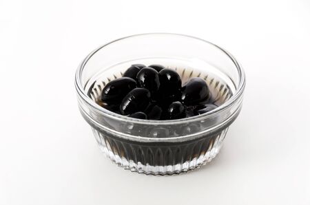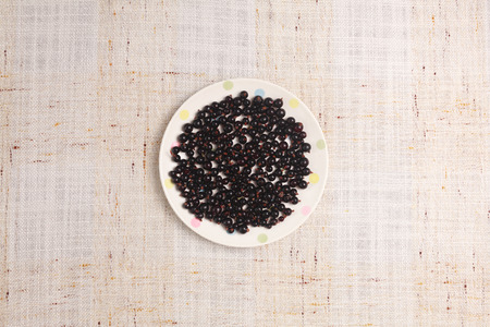 Lot of whole black bean in glazed bowl with brown ceramic coaster isolated on black glass