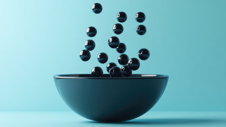 An artistic representation of black spheres gracefully floating above a glossy bowl against a soft blue background, creating a captivating abstract visual.