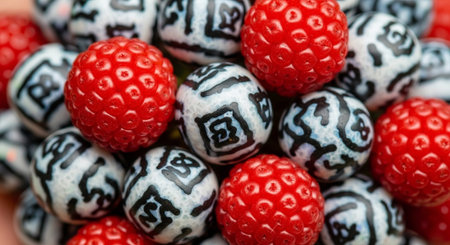 A detailed close-up presents a striking arrangement of vibrant orange speckled oval confections surrounded by numerous smooth, glossy black sweets. The contrasting colors and distinct textures form an engaging visual pattern. This appealing composition is suitable for various design projects, confectionery themes, or as a sophisticated background element, highlighting the interplay of light and shadow on the dark and bright surfaces.