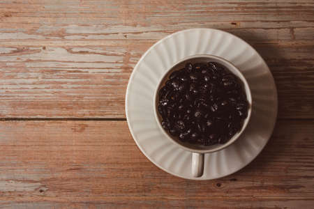 Coffee cup filled with coffee beans on vintage wooden surface. Copyspace. Selective focus.