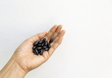 Black soft capsules in girl hand over blurred white cement texture background, vitamin, health and medical concept
