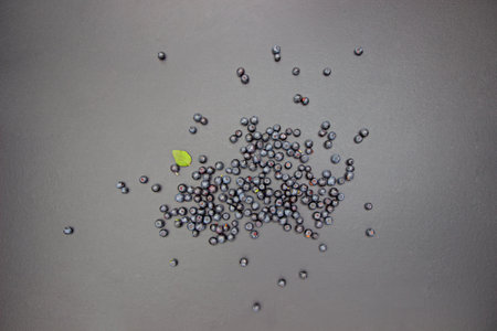 Ripe and tasty blueberries with green leaves on dark background. Bilberries close-up. Copy space for your text. Healthy food concept