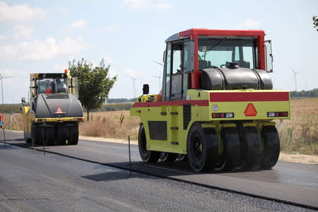 industrial landscape with rollers that rolls a new asphalt in the roadway. Repair, complicated transport movement.