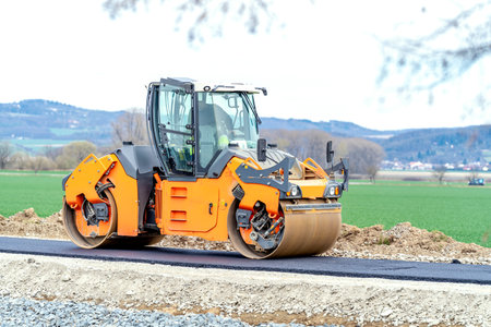 roller for asphalt compaction during the construction of a new road and traffic communication