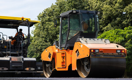 Asphalt road roller with heavy vibration roller compactor working on highway construction site.