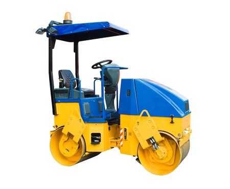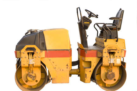 Driver control motor vehicle or heavy roller wheel tires or steamroller for road making or street - highway construction isolated on white back ground with clipping path