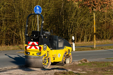 A yellow road roller is parked next to a bike lane, indicating roadwork in progress. The sun shines brightly, highlighting the trees in the background. Safety signs are visible nearby.