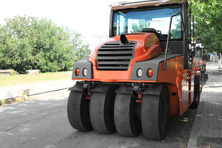 Close view on the road roller working on the new road construction site. Asphalt roller side view. Road repair work, paving asphalt. Asphalt compactor parked at roadway. Nobody, street photo