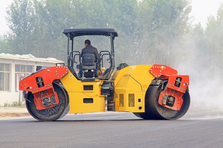 Heavy duty vibratory road roller for asphalt concrete works and road repairs. Heavy machinery when repairing asphalt pavement