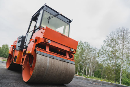 Orange Vibration roller compactor standing on a ground near asphalts road at road construction and repairing asphalt pavement works with a blue sky.