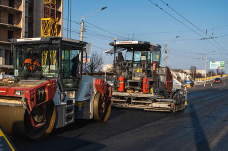 Chisinau, Moldova, March 25, 2019: Industrial landscape with rollers that rolls a new asphalt in the roadway. Repair, complicated transport movement. New, freshly-laid asphalt on the road. Construction of roads.
