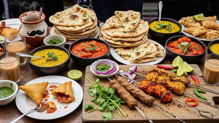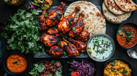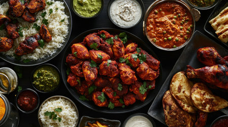 An inviting spread of Indian cuisine featuring chicken tikka masala, tandoori chicken, and classic appetizers. Feast of aromatic spices and flavors.