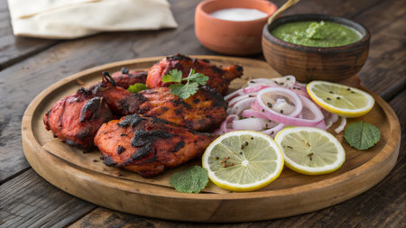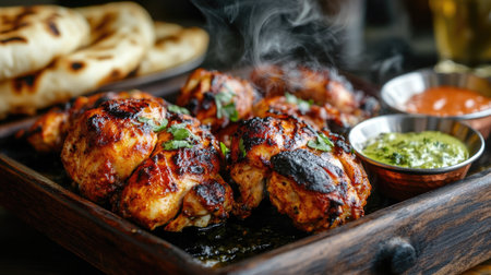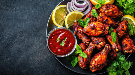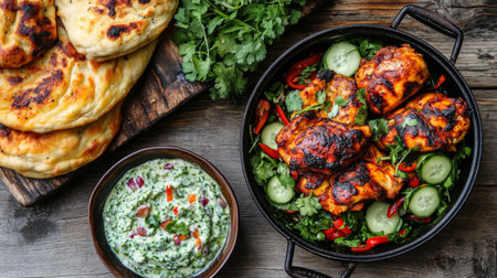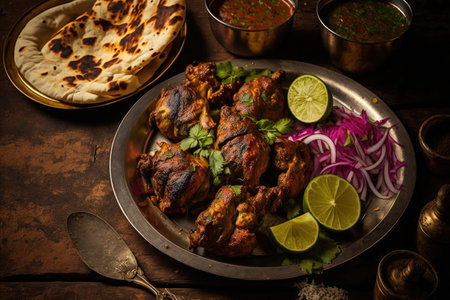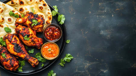 Top view of Indian tandoori chicken with naan and chutney, space for text or branding
