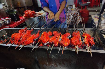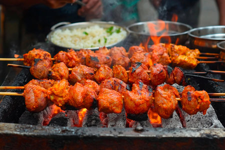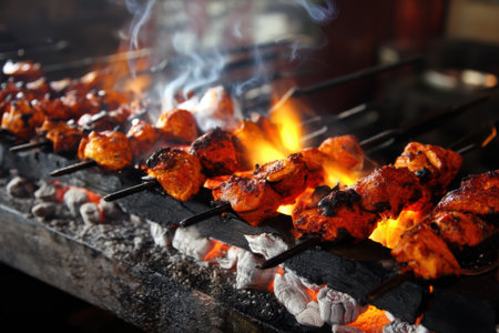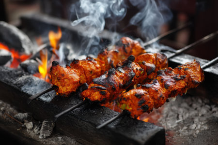 Tandoori Chicken Skewers Roasting Over Fiery Embers with Vibrant Spices in Night Glow