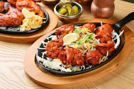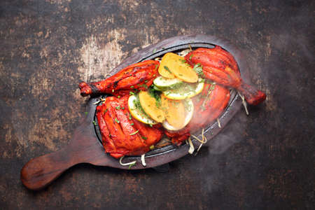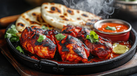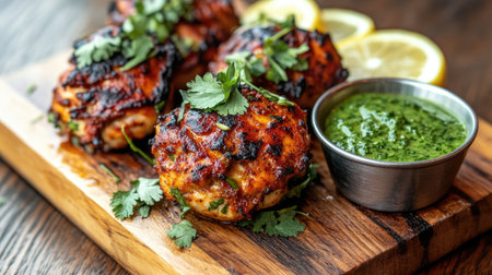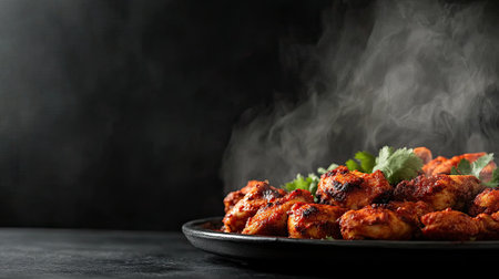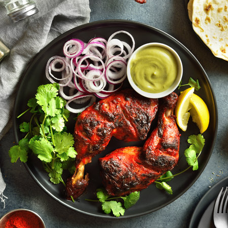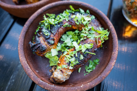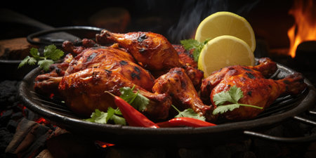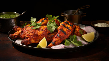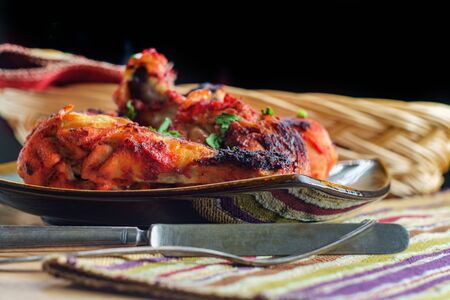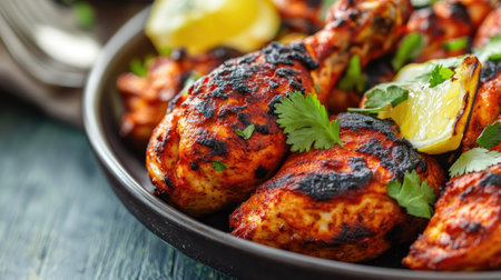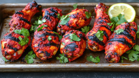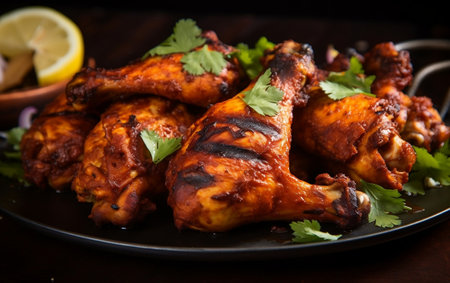Indian cuisine spicy red Tandoori chicken with cilantro garnish