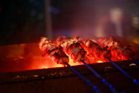 Juicy slices of meat prepare on fire, shish chicken kebab. Kebabs on skewers roasted on the grill outdoors. The skewers on the grill top view