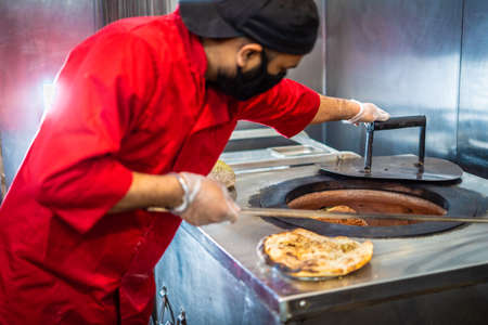 Enjoy a mouthwatering plate of grilled chicken drizzled with spicy sauce. This hot dish is served with traditional breads and fresh herbs.