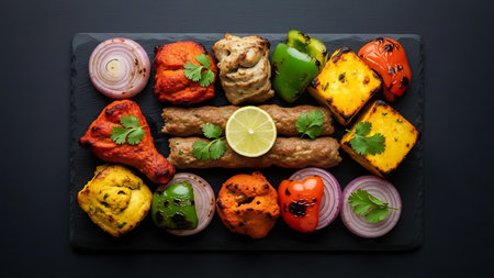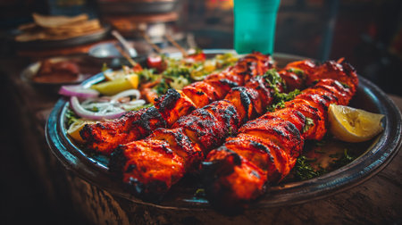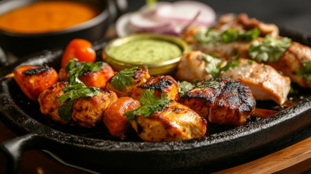A vibrant Indian cuisine platter featuring grilled skewers, flavorful sauces, fresh herbs, and side dishes. Perfect for gatherings and food lovers. Enjoy!