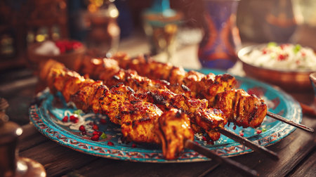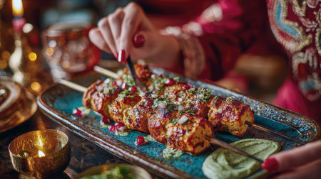 Close-up shot of delicious, vibrant Indian chicken tikka kebabs served on skewers atop a turquoise plate with green mint chutney and sprinkled with pomegranate seeds. A person in rich traditional clothing is about to eat, illuminated by candlelight.
