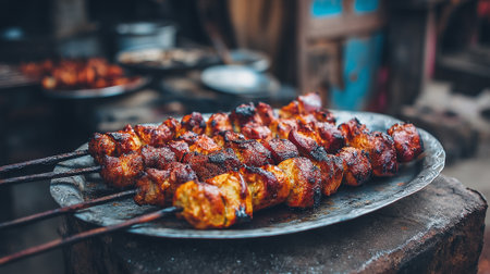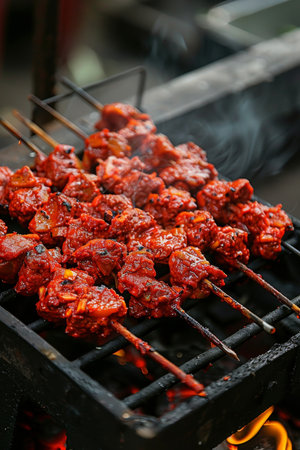 Vibrant skewers of seasoned meat on sticks, inspired by pantonepunk style, a culinary delight