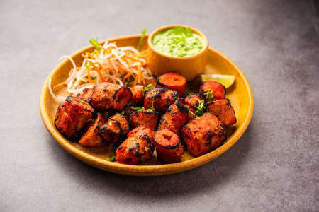 Indian chicken tikka kebabs, marinated in spices and yogurt and roasted in tandoori. served with green chutney and onion. selective focus