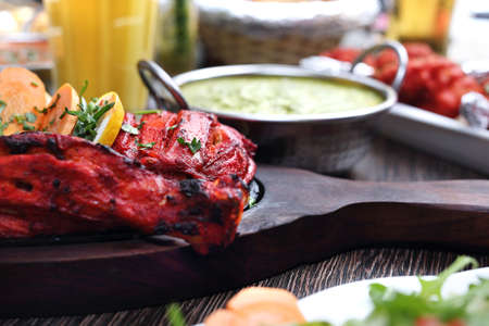 Indian cuisine spicy red Tandoori chicken with cucumber raita
