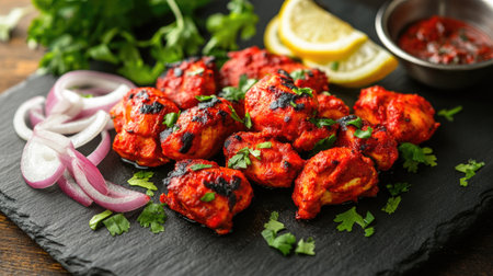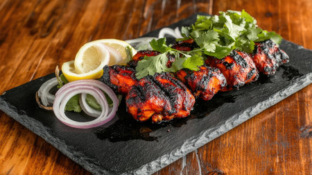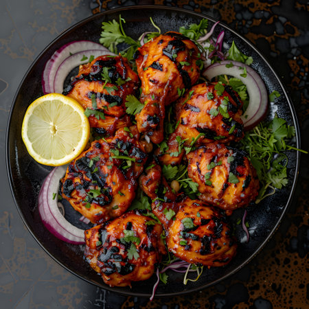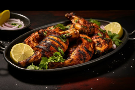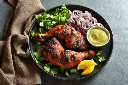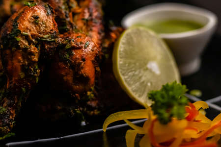 Tandoori chicken served with cilantro and onion on plate over dark stone background. South Asian dish of marinated chicken meat. close up view