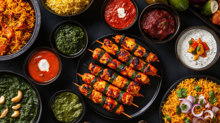A delicious assortment of Indian dishes including chicken tikka, palak paneer, and biryani, perfect for a traditional feast.