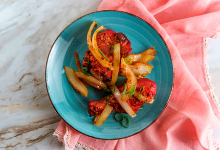 Appetizing spicy dish. Red chicken baked in a colorful marinade.