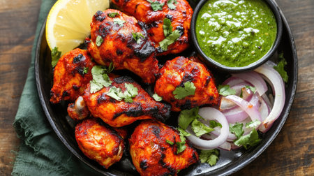 A top view of a beautifully arranged plate of tandoori chicken with lemon wedges, onions, and mint chutney