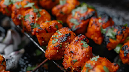 A close-up of a sizzling tandoori chicken skewer, fresh from the grill