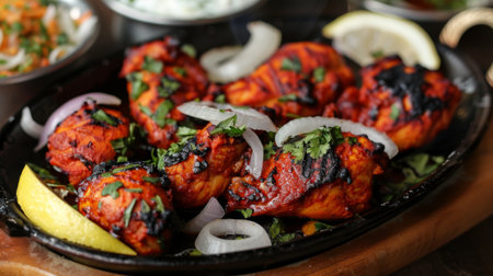 Close up shot of Indian Tandoori Chicken garnished with colorful veggies