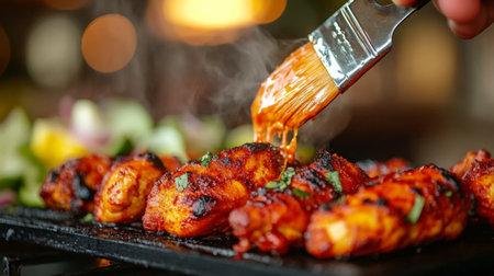 A close-up view of grilled chicken wings being brushed with a spicy glaze, showcasing rich colors and textures, ideal for food lovers and culinary photography.