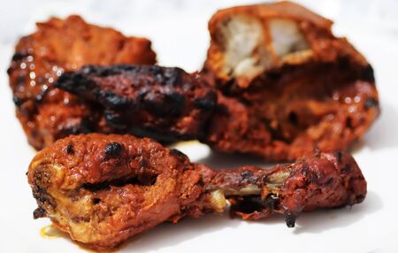 Chicken tandoori leg piece, an indian punjabi spicy preparation in white background with selective focus on foreground