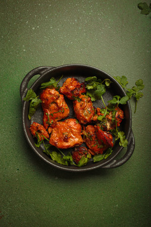 Delicious tandoori chicken garnished with coriander in cast iron pan top view on green background