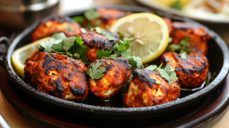 A sizzling iron plate of hot and spicy paneer tikka, garnished with fresh coriander and lemon slices.