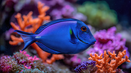A stunning blue fish glides gracefully through a vibrant coral reef, showcasing the beauty and diversity of underwater life in a clear ocean setting.