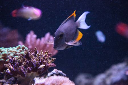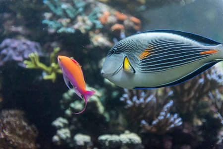 Colorful fishes in the deep under water, sea fish in zoo aquarium, close up