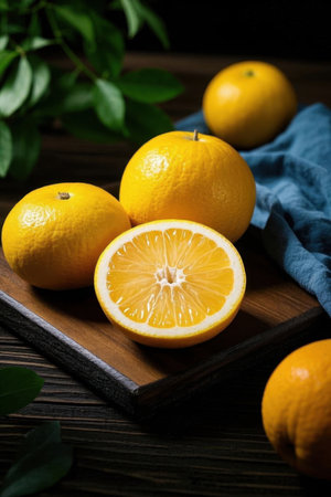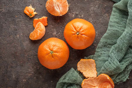Fresh organic tangerine fruits on rustic wooden table and copyspace