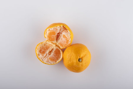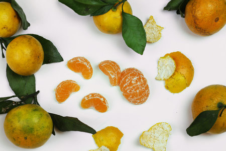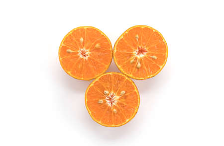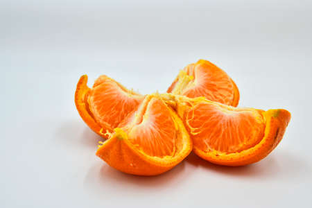 Slice of ripe tangerine isolated on white background. Delicious and beautiful Tangerines. orange or mandarin slices on a Background. Citrus background, top view, macro shot