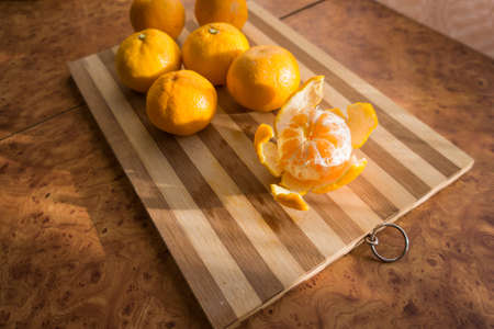 Tasty peeled mandarins in a wooden container. Exotic fruits on a wooden table. Light background.