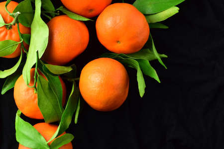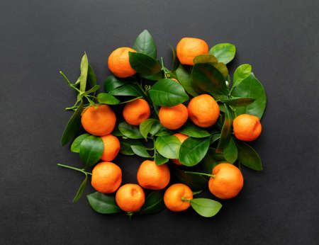 Fresh mandarin oranges fruit or tangerines with leaves on the table. Top view.