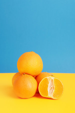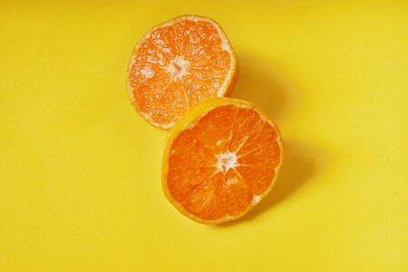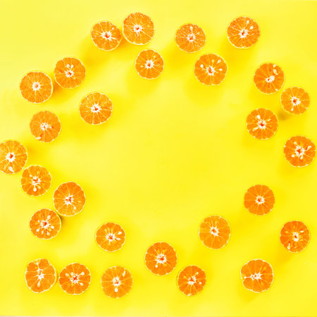frame juice fruit tangerine half cutting segments orange background tropical summer yellow bright background citrus food top view flat lay