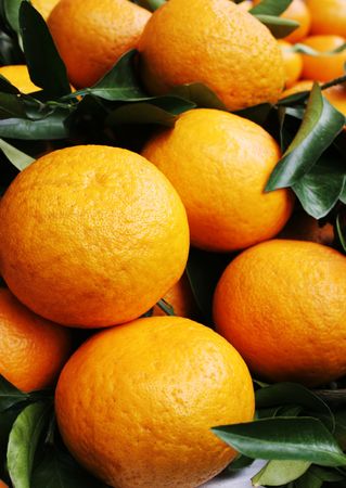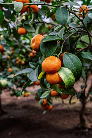 Tangerines on branches. Bright fruit on spring green branches.Cy