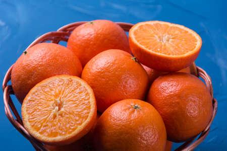 Delicious and beautiful fresh tangerines in wicker basket on blue background