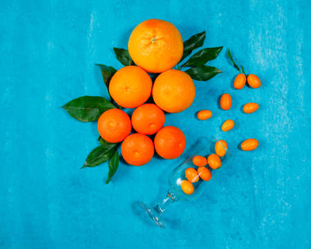 Top view mandarin oranges with leaves on blue textured background. horizontal