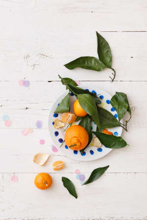 Closeup of plate with tangerines on white wooden background with colorful confetti. After party