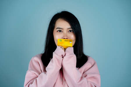 Portrait of an Asian girl wearing a pink shirt. in mobile credit card pose for a photo with a happy face Looking at the camera, behind a gray background in the studio.