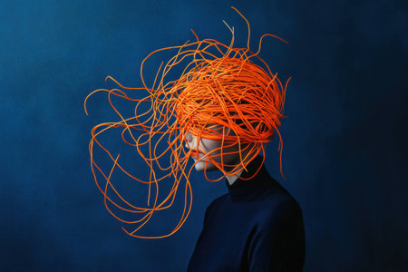 A surreal portrait of a woman with vibrant orange hair made of tangled strings, set against a deep blue background, evoking emotions of creativity and abstract art